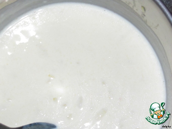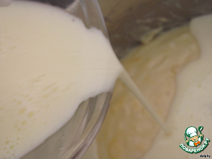 Молоко смешайте с 50 г муки. Отдельно взбейте 3 яйца со сливками.