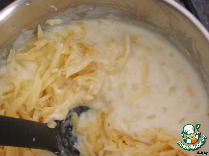 Снимите с огня и добавьте яично-сливочную смесь. Сырная масса получается очень густой и тягучей и сначала совсем не хочет смешиваться с яично-сливочной, но если пару минут поработать венчиком, то все получится.