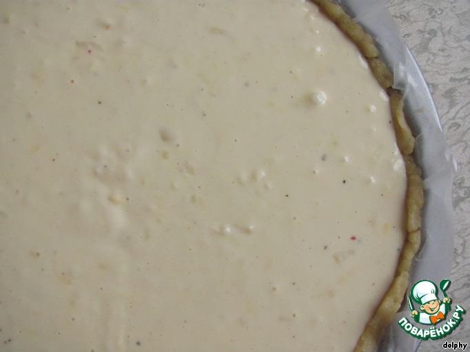 Дно формы с тестом присыпьте сухарями (я этого не делала) и вылейте начинку.