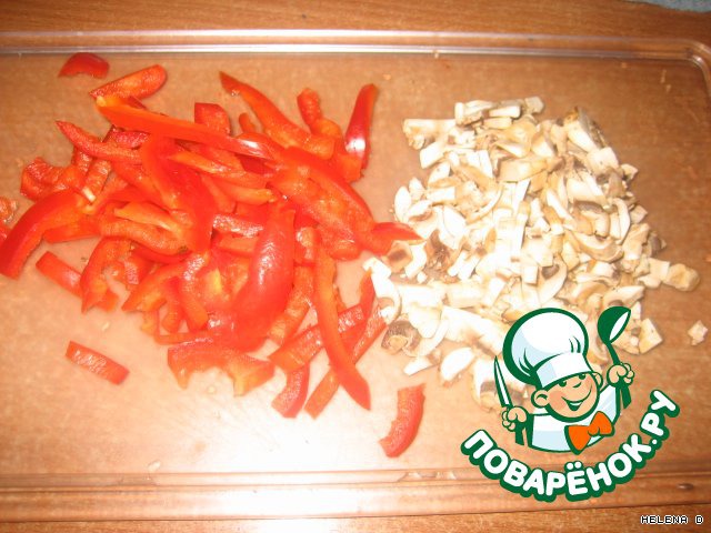Шинкуeм перец и грибы, обжариваем до готовности.