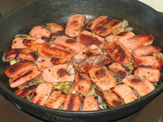 Следующий слой - сосиски или другой мясной продукт, тоже обжарить