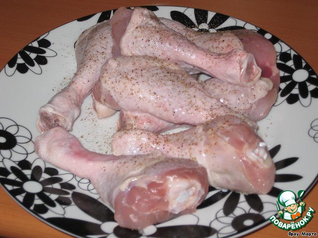 Берем куриную голень, моем, солим, перчим, я присыпаю сухими травками еще.