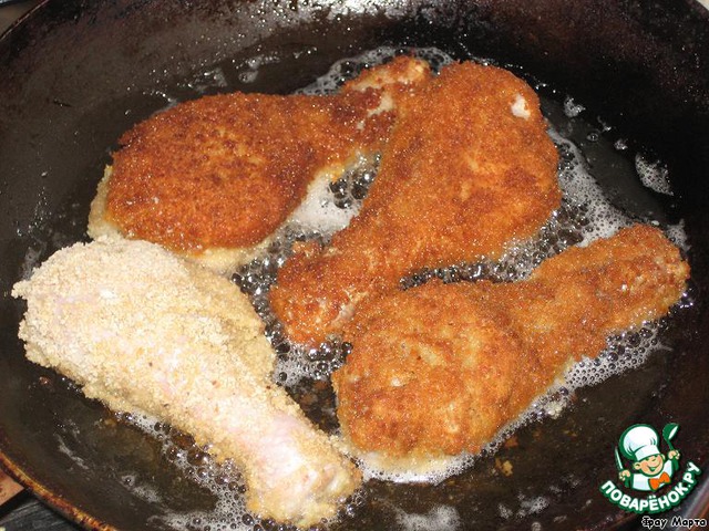 Берем куриную голень, обмакиваем в яйце, затем в муке, опять в яйце и в панировочных сухарях - и в разогретое масло.