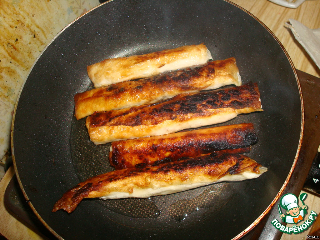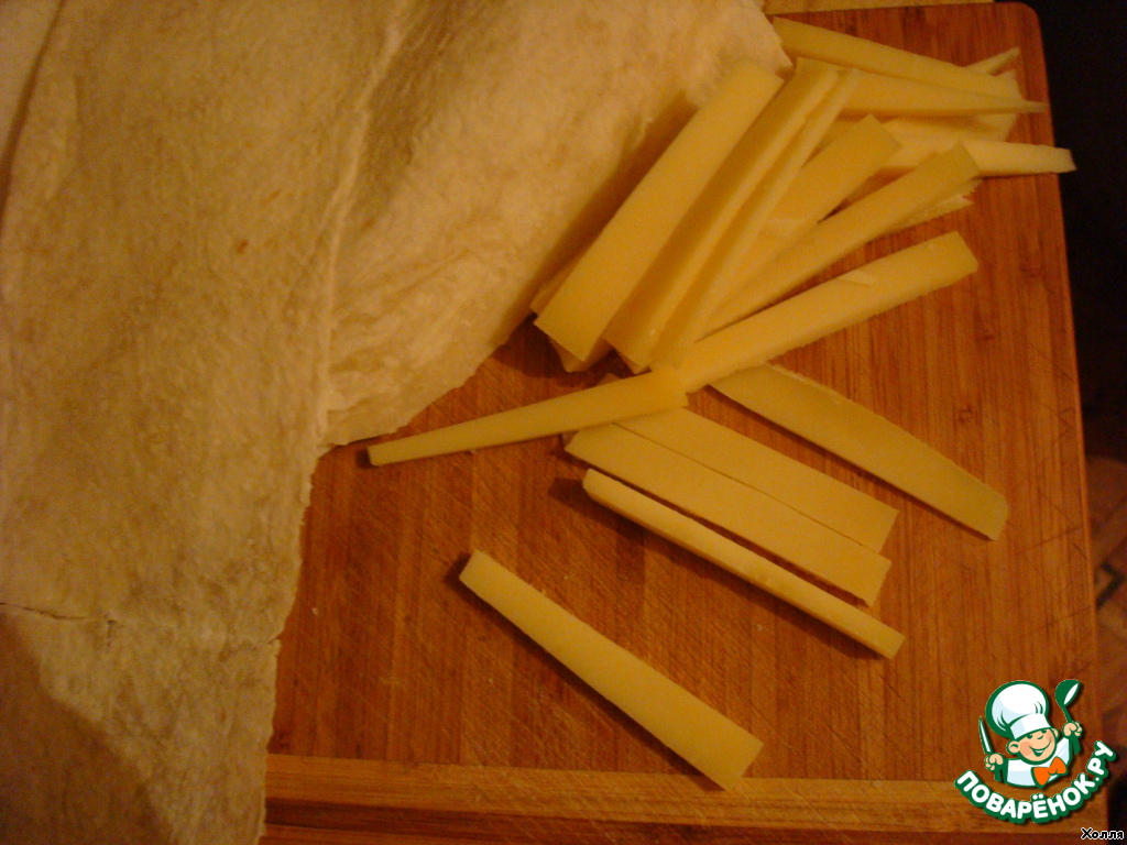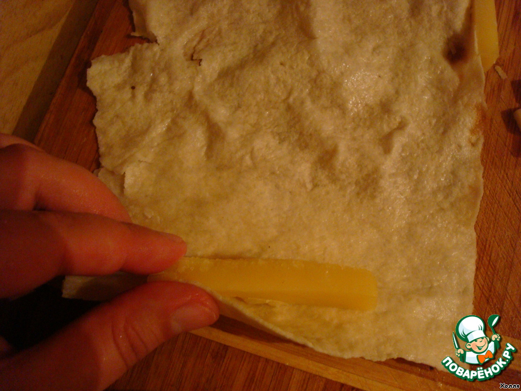Нарезаем сыр брусочками. Разрезаем лаваш на прямоугольники с одной из сторон, равной длине брусочка сыра, но это не обязательно, можно брать размер прямоугольников лаваша чуть больше, главное, чтобы сыр не вытек в сковороду и дождался вытекания Вам в рот :)