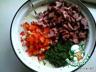 Замесить тесто, как для обычных оладий. Перец, колбасу (у меня были охотничьи колбаски) нарезать мелкими кубиками. Зелень мелко порубить.
