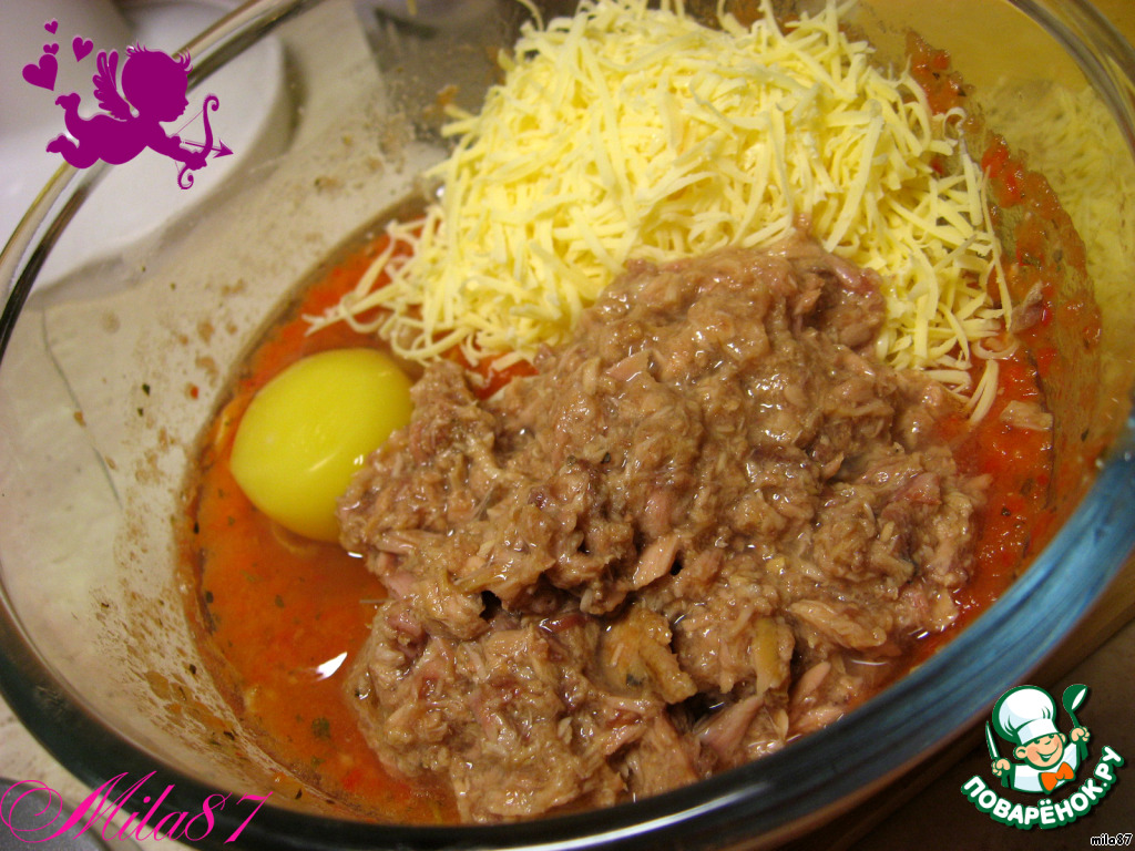 Смешиваем томатную смесь с одним яйцом, тунцом и сыром.