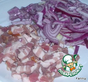 Сметану взбить со сливками и яйцами затем смешать с поджаренными луком и грудинкой, солью, белым перцем и мускатом.