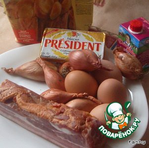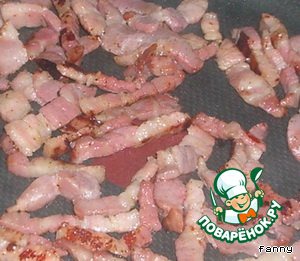 Грудинку поджарить на сковороде, добавить масло и лук, подрумянить его, снять сковородку с огня и дать массе немного остыть.