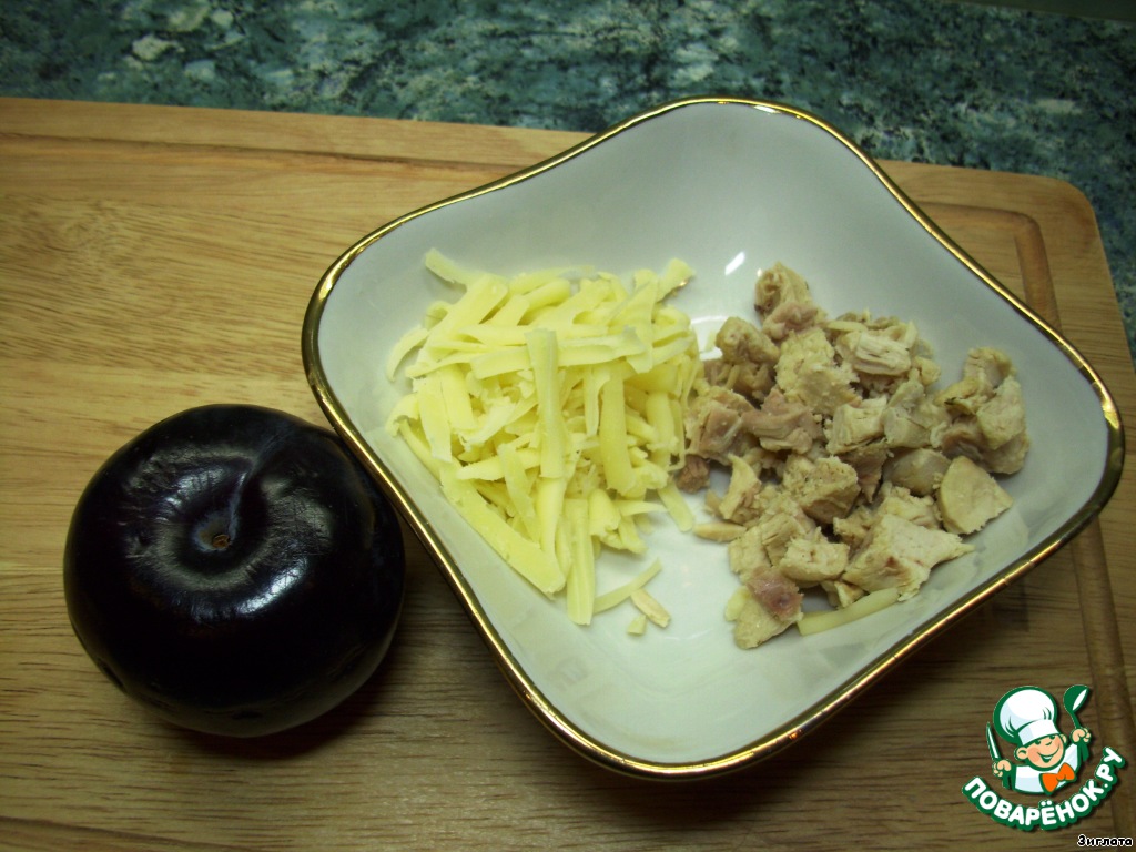 Курицу и сыр смешать с майонезом, немного посолить и поперчить