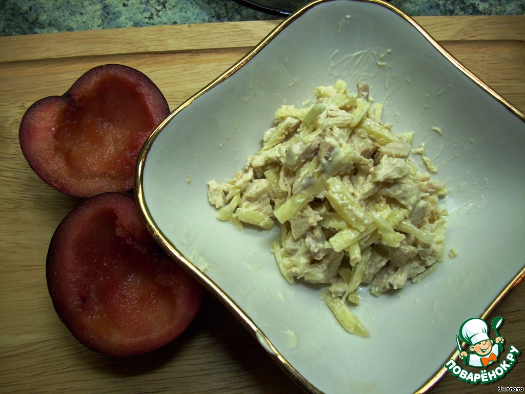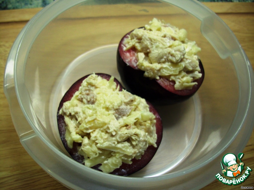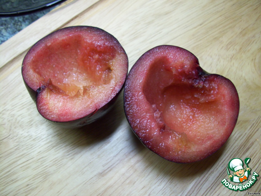 Сливу вымыть, вытереть. Разрезать на две части, вынуть косточку и удалить немного мякоти. Мякоть тут же съесть!