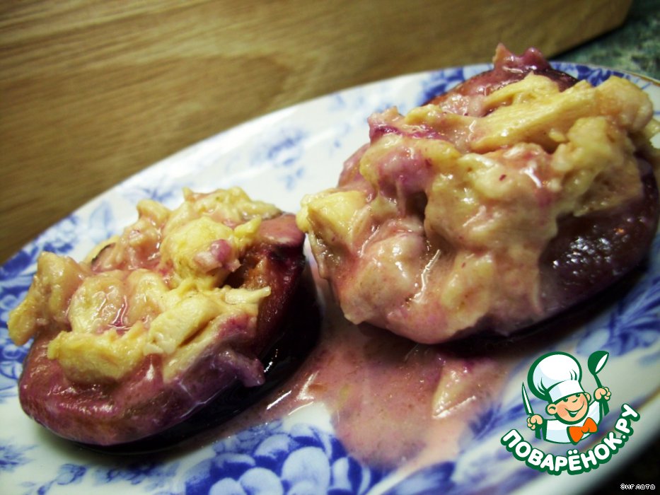 Наполнить этой смесью половинки сливы, положить в небольшую емкость, подходящую для микроволновки. Неплотно прикрыть крышкой и поставить в печь на среднюю мощность (у меня это 400 Wt) на 2,5-3 минуты