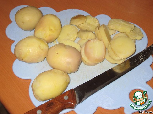 У меня был картофель отварной в мундире (остатки от винегрета). Очистила и порезала не тонкими кружочками.