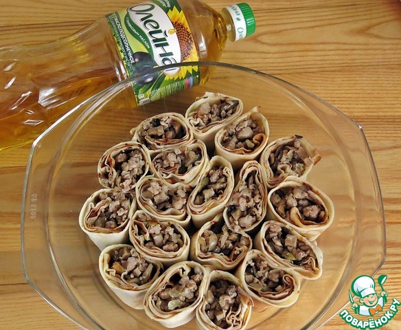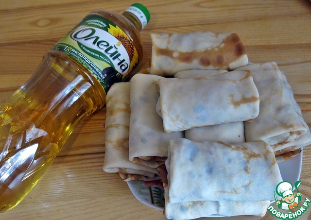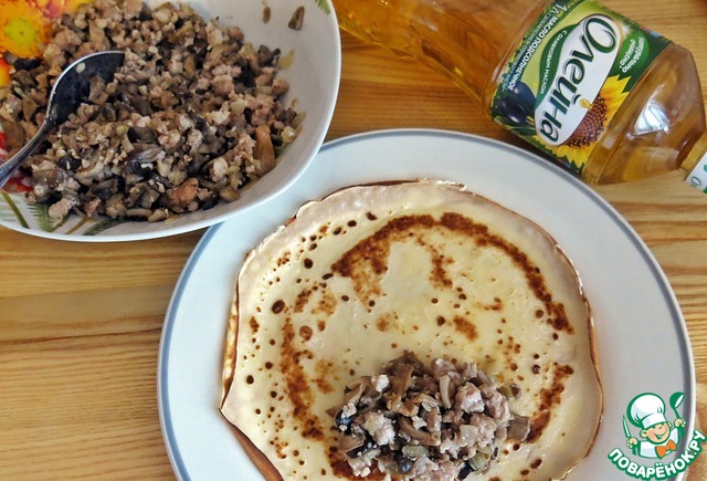 Сковороду смазываем растительным маслом и выпекаем блинчики. На край блинчика выкладываем начинку.