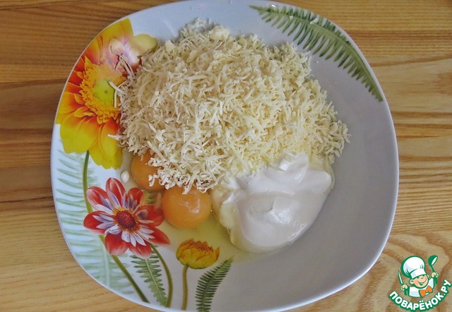 Подготовим заливку. Яйца, сметану и сыр, натертый на мелкой терке, смешиваем до однородной массы. Т. к. сыр у меня был - несоленый, я эту массу немного посолила.