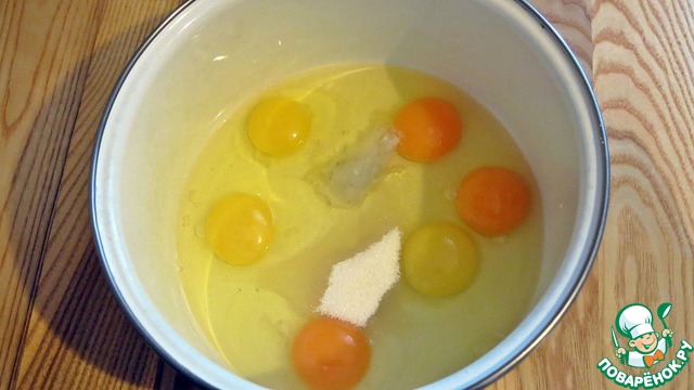 Яйца, сахар и соль - немного взбиваем.