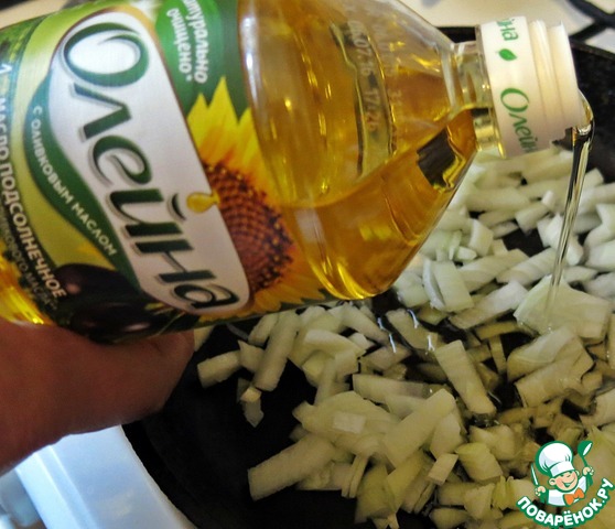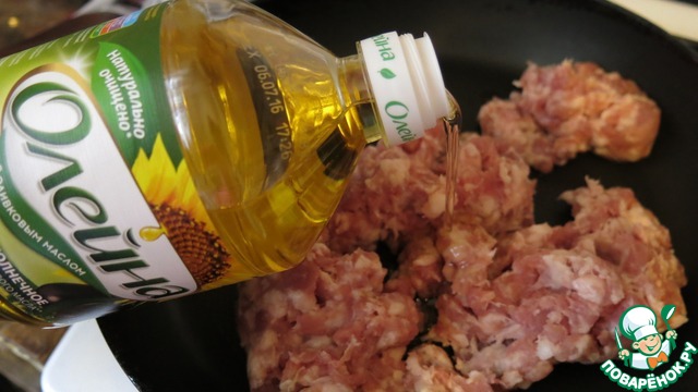 Тем временем, подготовим начинку. Фарш, обжариваем до готовности, на растительном масле. Солим по вкусу.