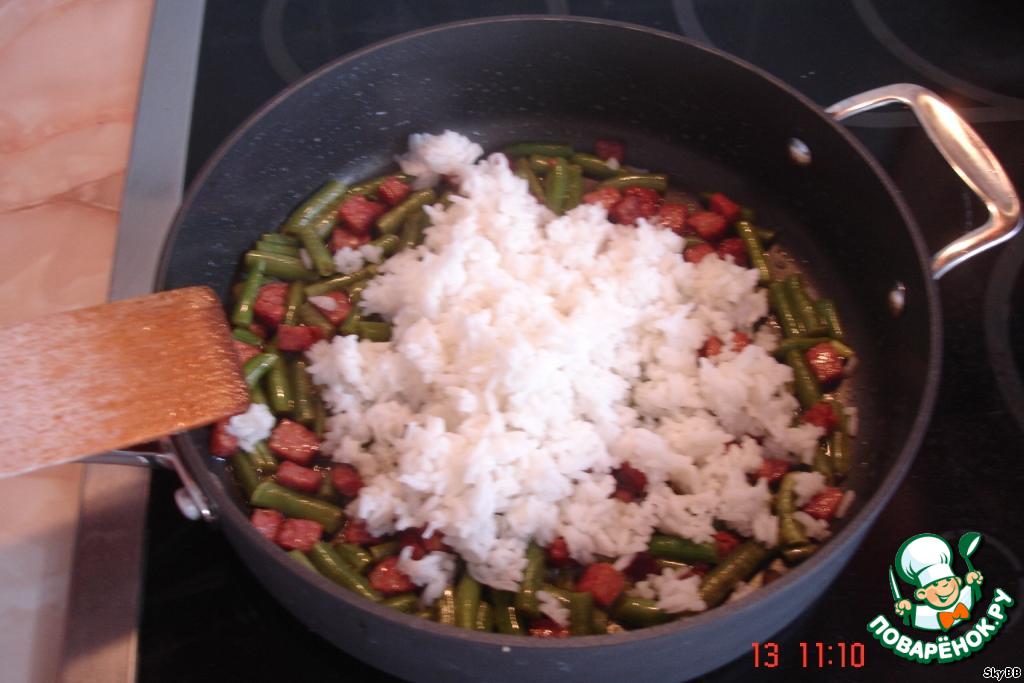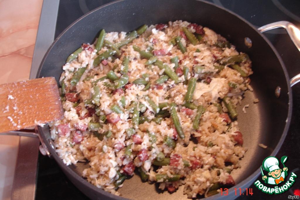 добавляем горсть замороженной зеленой фасоли и обжариваем еще пару минут,