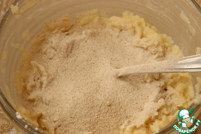 Теперь добавить сухие ингредиенты, просеивая через сито: сахарную пудру, разрыхлитель теста и гречневую муку. Перемешать.