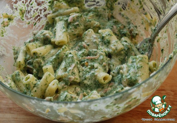 В глубокой миске смешать лук, чеснок, шпинат, творог, ветчину, сыр, муку, яйца и оставшиеся макароны. Посолить, поперчить по вкусу.