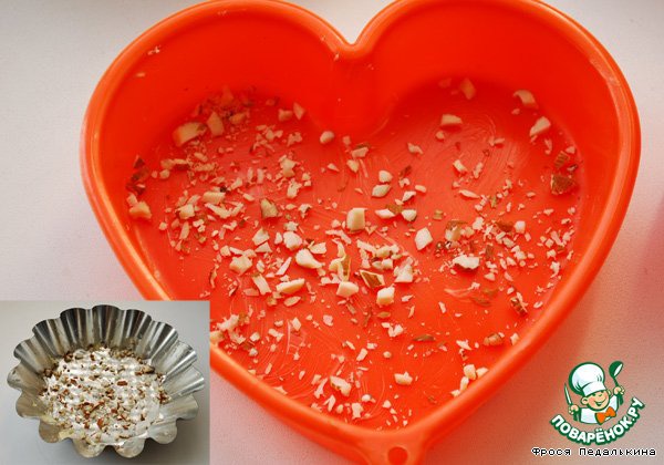 Порционные формочки смазать маслом, посыпать измельченными орехами (у меня миндаль). Выложить 1 слой макарон на дно.