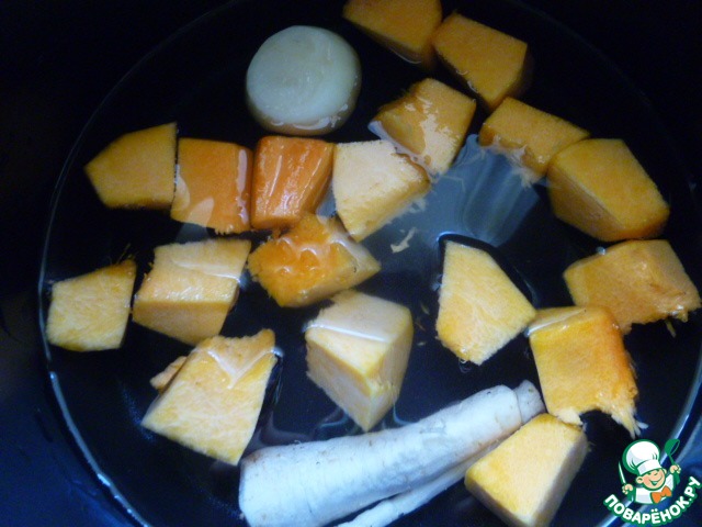 В чашу мультиварки кладем очищенную и порезанную на кусочки тыкву, луковицу, пастернак и корневую петрушку.