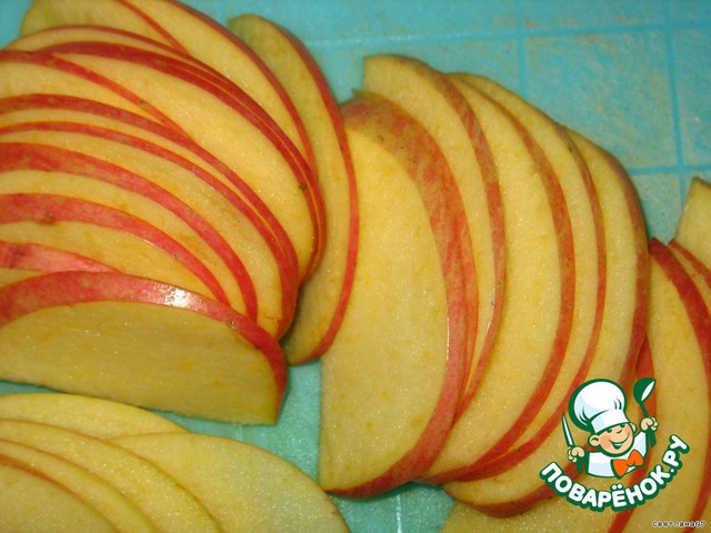 Яблоко порезать на 4 части, вырезать серединку. Порезать каждую четвертинку тонкими пластинками, около миллиметра.