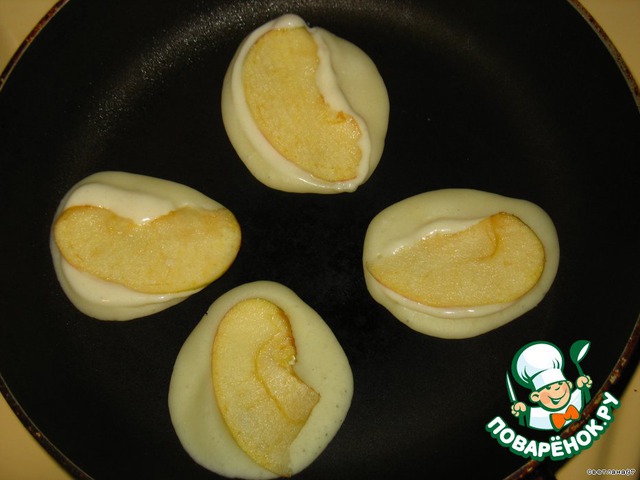 И сразу же на каждый оладик кладем по пластинке яблока. Я провозилась с фотоаппаратом, оладьи уже успели "схватиться", а вообще яблоки должны слегка утонуть в тесте, когда оно еще совсем жидкое. Только не вдавливайте яблоко в оладик, а то будут рваться при переворачивании.