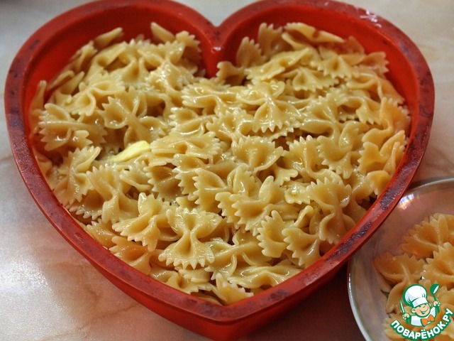 Макароны отварить до готовности, слить воду. (Я отложила небольшое количество бантиков для украшения, но это не обязательно). Выложить макароны в форму для запекания, добавить сливочное масло и перемешать. Дать им немного остыть. Включить на разогрев до 180 градусов духовку.
