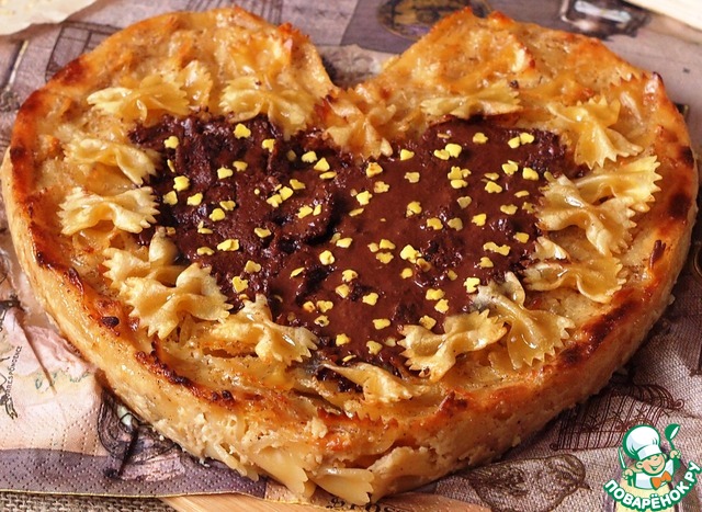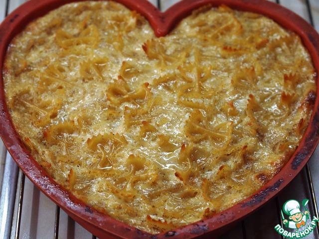 Этот шаг необязателен, но я решила украсить свой подарок и на горячую запеканку уложила отложенные макароны-бантики и кусочки шоколада.