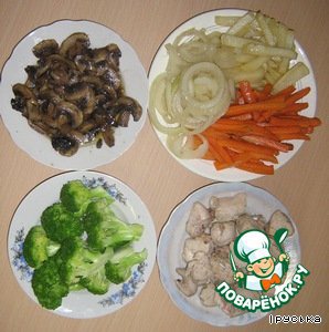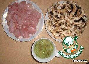 Куриное филе нарезать крупными кусочками. Шампиньоны порезать ломтиками.