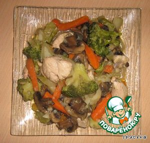 Овощи, грибы и мясо обжарить по отдельности на растительном масле, посолив и преправив специями. Брокколи обдать кипятком. Выложить все в сотейник, добавить немного бульона и тушить на медленном огне около 20мин.
