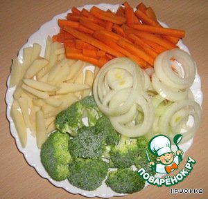 Морковь и картофель вымыть, очистить и нарезать соломкой, лук - кольцами. Брокколи разделить на соцветия.