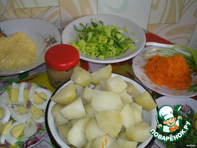 Картофель отварить в мундире, слегка подсолив воду. Яйца также отварить.