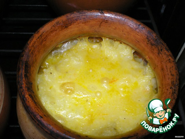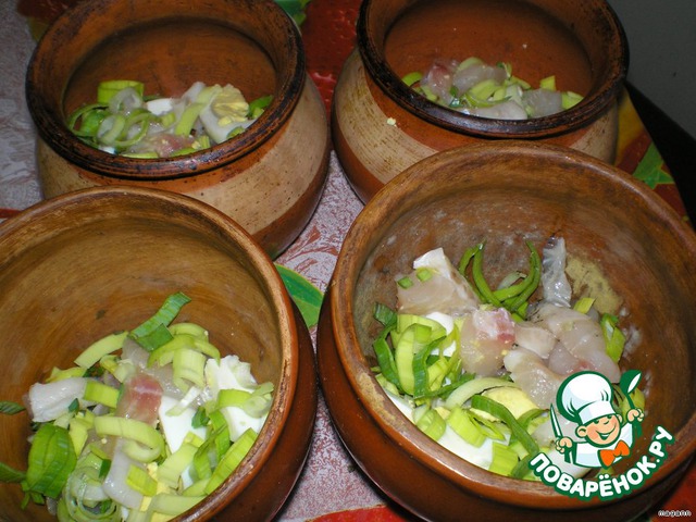 В горшок выкладываем рыбу, яйца, лук порей и зелень чеснока, аккуратно перемешиваем. Заливаем соусом.