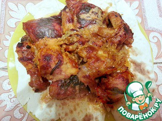 На блюдо выкладываю лаваш, я его обычно рву, поскольку он получается очень вкусным. На лаваш выкладываю курочку и сверху выливаю сок (от курочки). Лаваш пропитывается соком и получается очень вкусным, мой муж обожает такой лаваш. Всем приятного аппетита)))