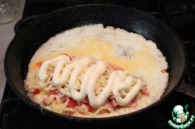 | Пирожки из омлета с начинкой из томатов, колбасы и сыра с майонезом |