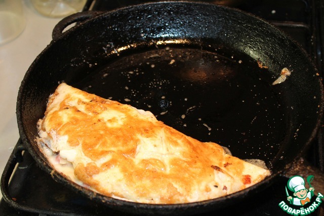 Подхватить лопаткой свободную половину омлетного блинчика и накрыть ей начинку, слегка придавив сверху.