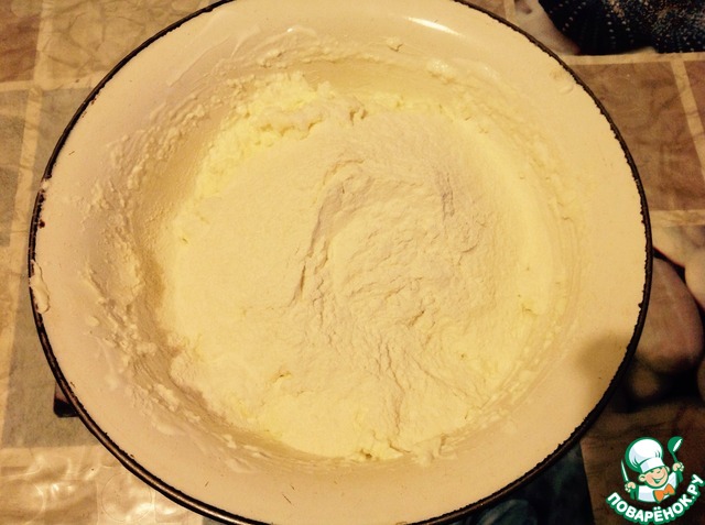 Положить муку и замесить тесто. Тесто желательно долго не месить иначе получится твердое