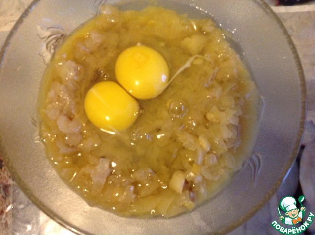 Тушенный лук охладить, вбить яйца