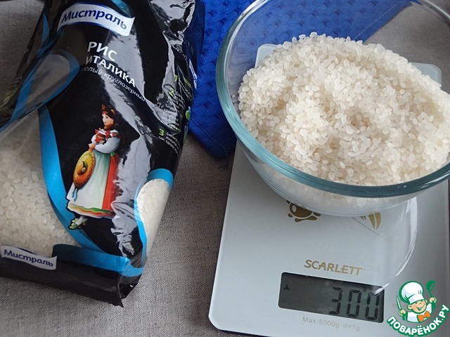 Отмерьте рис. Мне очень хорошо известно, что для ризотто существуют специальные сорта риса. Но мне захотелось попробовать в этом блюде белый круглозерный рис ИТАЛИКА ТМ Мистраль. И надо признаться, результатом я осталась очень довольна.