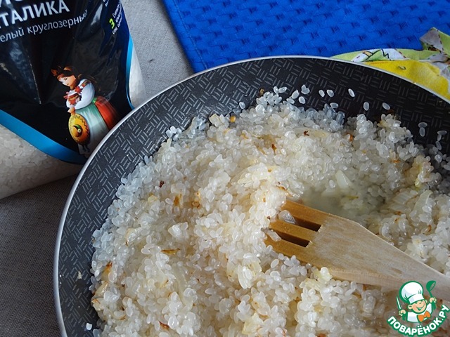 Тем временем готовы лук и чеснок, добавляем в сковороду рис и перемешиваем. Рисинки под действем масла становятся прозрачными и очень красивыми.