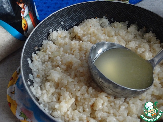 Влейте пару половников горячего бульона. Готовьте пока рис его не впитает. Вливайте понемногу бульон еще 2-3 раза. Постепенное вливание жидкости помогает рису не слипаться. Мне очень нравится процесс приготовления ризотто. Забавно наблюдать стадии "взросления" рисинок.)))