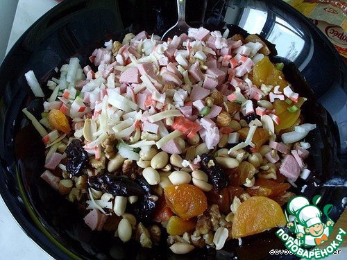 Все продукты, взятые с полочки в супермаркете, режем кусочками и бросаем в тот же тазик.
