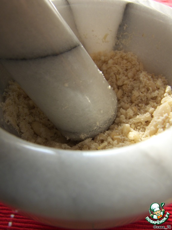 Измельчаем 80 г кедровых орешков или грецкий орех (очень хорошо подходит к голубым сырам!) в блендере или ступке, если она у вас есть.