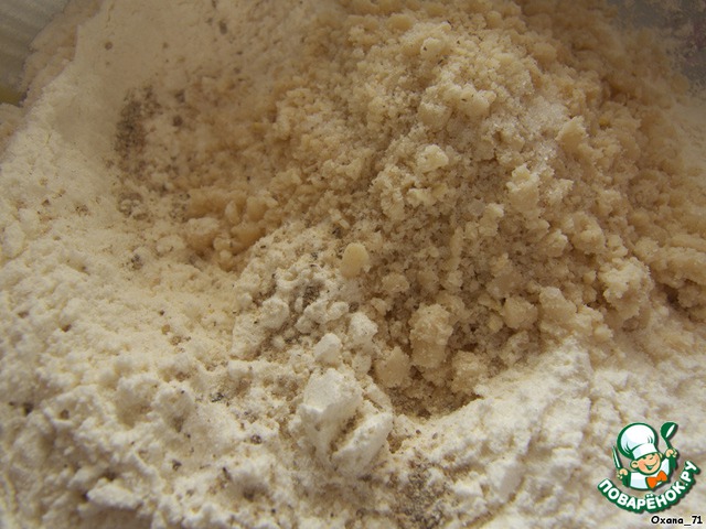 Масло порубим или натрём на тёрке. Сыр порежем мелко на кусочки. Добавим к мучной смеси и разотрём всё пальцами "в крошку".