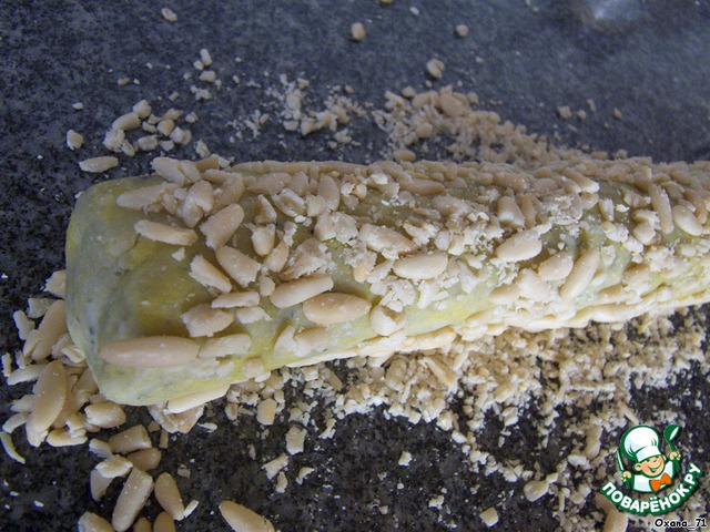 Насыпаем их на разделочную доску или на рабочий стол. Обваляем "цилиндрик" в орехах таким образом, чтобы использовать все орехи. См. фото!