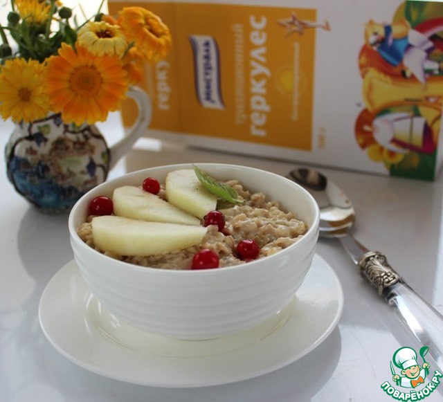 В готовую кашу вмешать нарезанную грушу. По желанию положить кусочек сливочного масла.