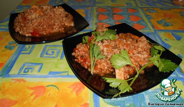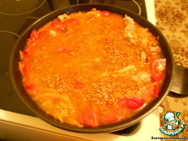 Далее добавляем промытую гречку и заливаем все горячей (!) водой и оставляем тушиться на медленном огне до готовности. За минут 5 до готовности добавляем приправы (я добавила тертый мускатный орех, 5 головок сушеной гвоздики и черный перец горошком).