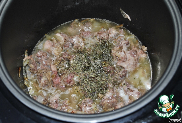 Добавляем тушёнку, посыпаем майораном и варим ещё 5 мин. Майоран в значительной степени "заглушает" запах тушёнки.