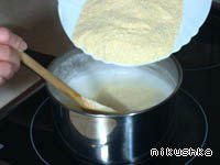 Влить воду и молоко в кастрюлю с толстым дном, довести до кипения, добавить перец и соль по вкусу, убавить огонь и постепенно всыпать кукурузную крупу или муку, постоянно помешивая